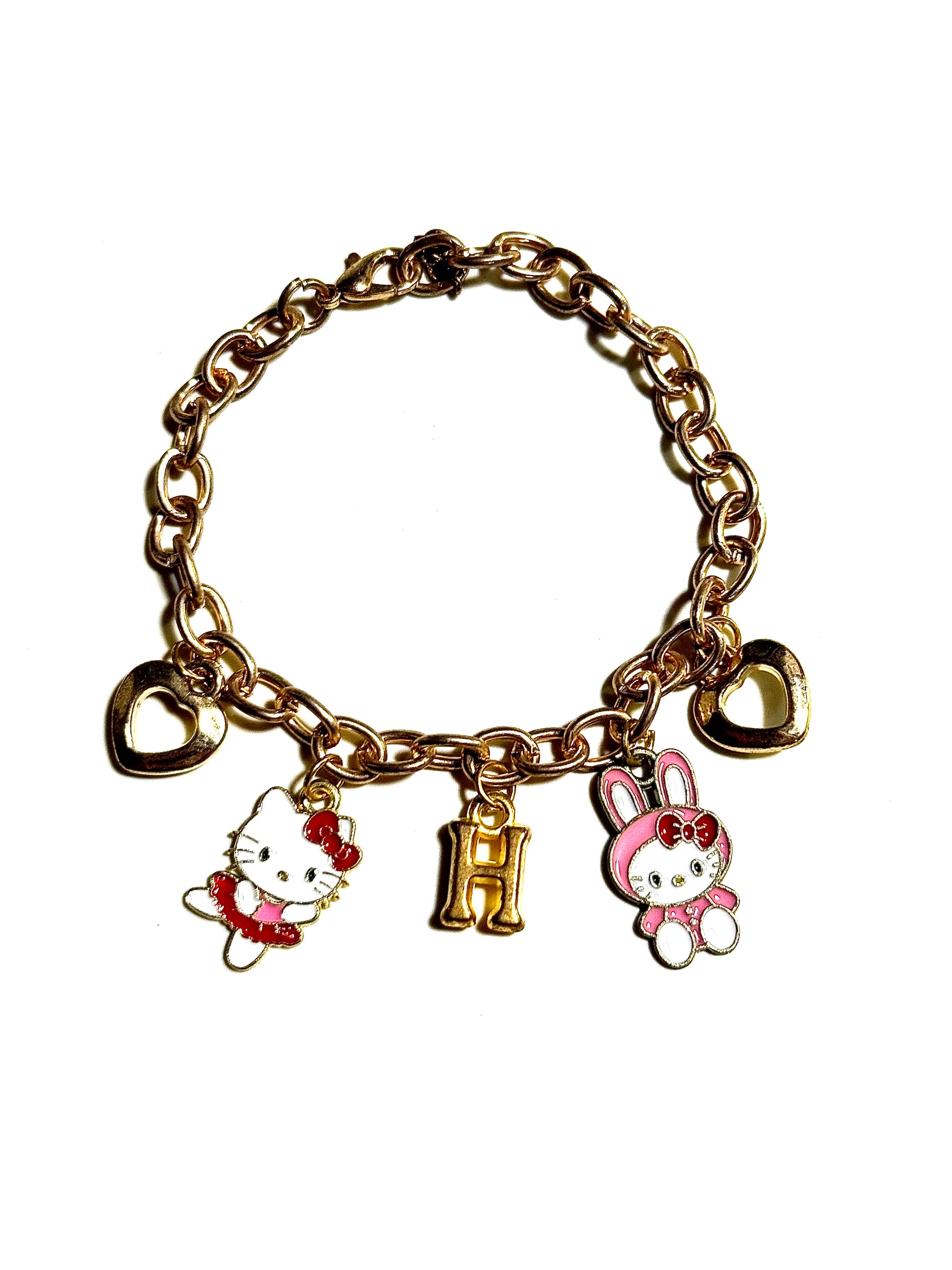 Elegant gold Hello Kitty charm bracelet featuring an ‘H’ initial and dainty heart charms—sweet, personal, and perfectly kawaii